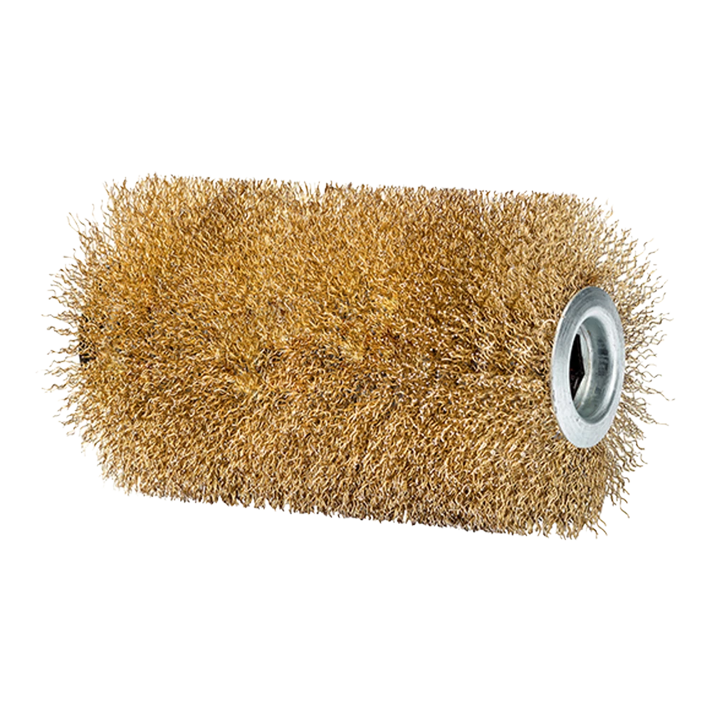 Staalborstel met messing coating (diameter 100 mm, lengte 165 mm) voor het krachtig reinigen van stenen oppervlakken. Geschikt voor het behandelen van ernstige verontreinigingen, zoals korstmossen, op niet-gevoelige oppervlakken. Niet geschikt voor gepolijste, geslepen of verzegelde oppervlakken van natuur- of kunststeen.