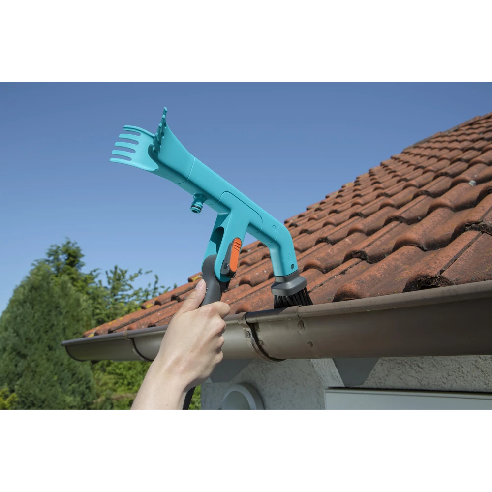 De GARDENA combisystem Gootreiniger is ideaal voor het gemakkelijk leegmaken en reinigen van dakgoten. Stevige borstels aan de ene kant en twee hoogwaardige, kunststof schrapers aan de andere kant zorgen voor efficiënte reiniging. De draaggreep maakt het mogelijk om de gootreiniger zelfs zonder steel te gebruiken. Het is ook mogelijk om water te gebruiken tijdens het reinigen. Een tuinslang kan eenvoudig worden aangesloten dankzij de Original GARDENA System aansluiting. De werkhoek is eenvoudig instelbaar met een quick-lock hendel. De gootreiniger past op alle GARDENA combisystem stelen, waarbij GARDENA een telescopische steel adviseert om tot ca. 5 meter hoog te kunnen werken.