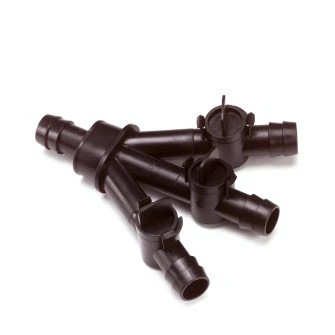 De kunststof driewegkraan heeft 4 aansluitingen van 19 mm.