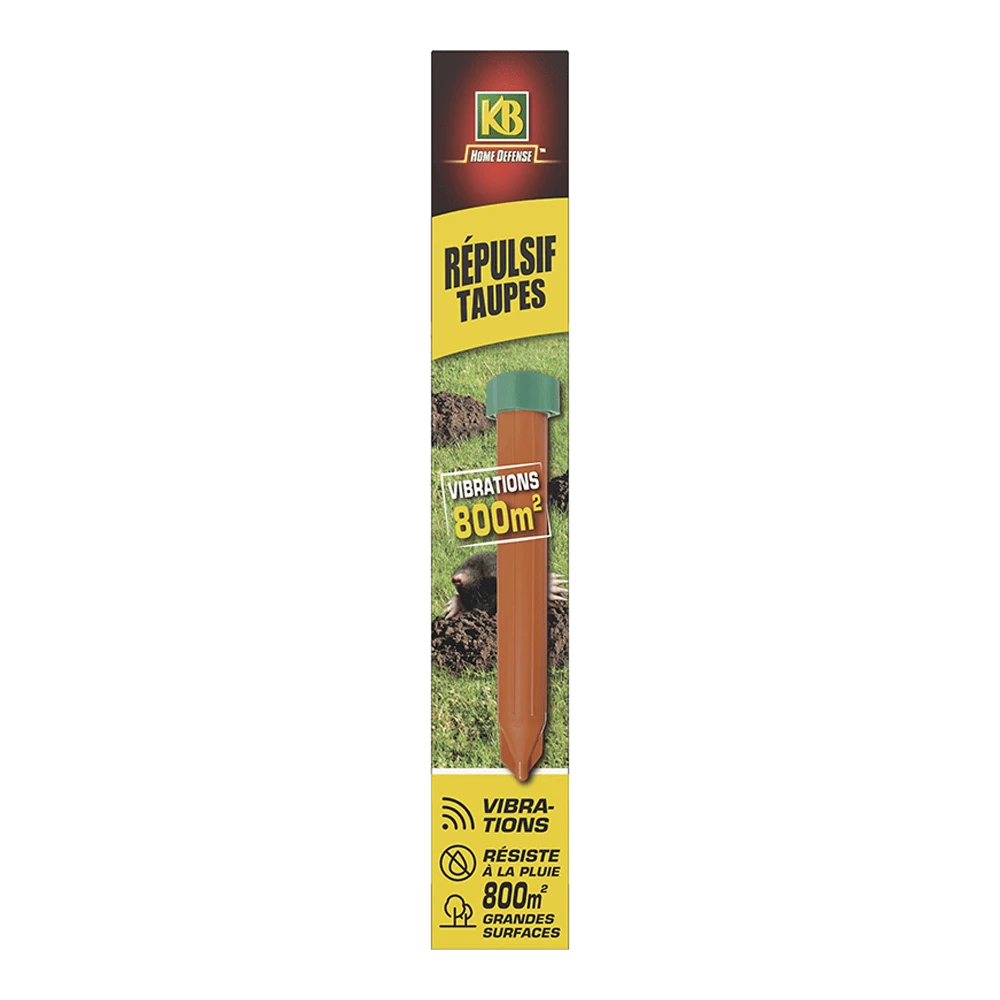KB Mollenverjager en Woelmuizenverjager 800m² werkt op basis van infrasoon geluid. Infrasoon geluid bestaat uit zogeheten infrasone trillingen. Dit zijn geluidsgolven waarvan de frequentie zo laag ligt, dat mensen dit niet kunnen horen. Mollen en woelmuizen hebben daarentegen een extreem goed ontwikkeld gehoor en zijn zeer gevoelig voor trillingen in de bodem. Dit apparaat is meest effectief bij mollen en woelmuizen. Het apparaat produceert elke 30 seconden een vibrerend geluid dat zich door de grond verspreidt tot maximaal 800m² (diameter: ongeveer 35m) afhankelijk van de grondsoort, dichtheid en vochtigheid van de bodem. De infrasone trillingen zijn intimiderend voor knaagdieren, omdat ze deze associëren met een inkomende dreiging (zoals een naderend roofdier). Het apparaat is waterdicht, bevat geen chemicaliën, is veilig in gebruik en veilig voor kinderen en huisdieren.