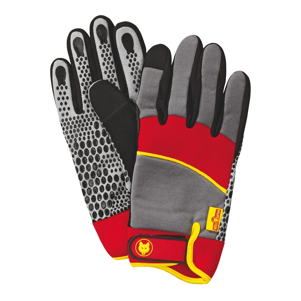 De WOLF-Garten machinehandschoen GH-M is voorzien van een extreem slipvaste binnenzijde van de handpalm, zodat (tuin)machines veilig bediend kunnen worden. De handschoen heeft een hoog draagcomfort door de verstelbare manchet en de ademende bovenzijde van de handpalm zorgt voor minder last van zweethanden. Met transpiratiedepzone op de duimen. De handschoen is wasbaar op 30ºC. Verkrijgbaar in 2 maten.. Zeer slipvaste binnenzijde van de handpalm. Ademende bovenzijde van de handpalm voorkomt zweethanden. Transpiratiedepzone op de duimen.