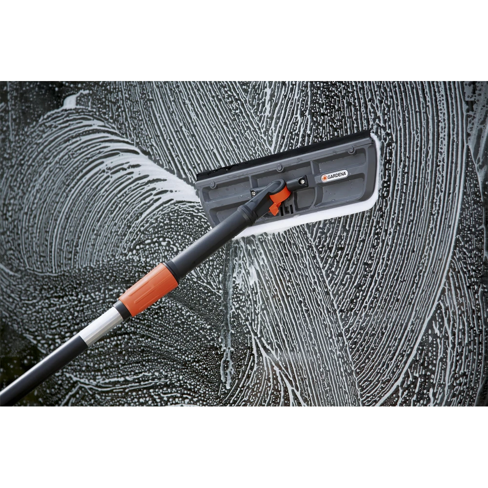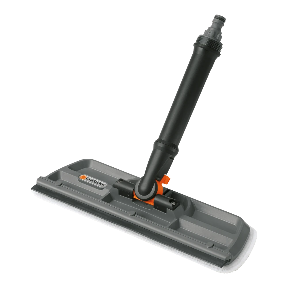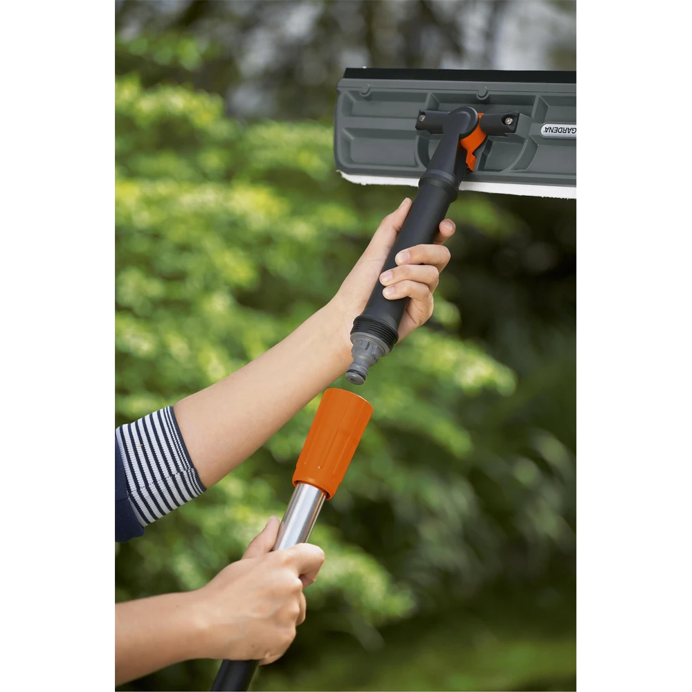 De GARDENA raamwasborstel met trekkerkan op het waterleidingnet worden aangesloten en is voorzien van een Original GARDENA System-aansluiting. Met de GARDENA raamwasborstel met trekker hebt u twee producten in één. Met het microvezeldoekje kunt u het glasoppervlak natmaken; met de wisser veegt u het water van het glas. Hierdoor kan elk glasoppervlak grondig en effectief worden gereinigd. De raamwasborstel met wisser kan op alle Original GARDENA Cleansystem Waterstelen (art. nr. 5552-20, 5550-20, 5554-20) worden aangesloten. Afhankelijk van de situatie kunt u de raamwasborstel als handgereedschap gebruiken of op een watersteel aansluiten. Door het hoogwaardige microvezeldoekje kunt u intensief reinigen. Het kan ook eenvoudig worden verwijderd en op 60° in de wasmachine worden gewassen. De GARDENA raamwasborstel met trekker heeft een draaischarnier dat 360° kan draaien. Hierdoor is dit product zeer flexibel en eenvoudig te gebruiken in elke situatie. Het draaischarnier kan ook worden vastgezet, zodat de wisser eenvoudig kan worden bevestigd. De wisser zelf is gemaakt van hoogwaardig, duurzaam rubber. Zo krijgt u schone en streeploze ramen. De GARDENA raamwasborstel met trekkerheeft een werkbreedte van 31 cm.